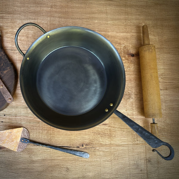 The Cowboy Classic features our signature forged stainless steel handle, attached with two solid brass rivets. This design offers a much lower heat transference from the pan base to the handle, keeping it comfortable to hold. Due to its increased size, we’ve also added a stainless steel helper handle to make this pan easier to lift and maneuver.